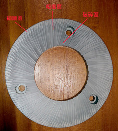 3、細磨區:磨豆機真正調整粗細研磨程度的區域在此,細磨區的刀盤傾斜角度更小,在平刀上是水平,錐刀則接近90度。